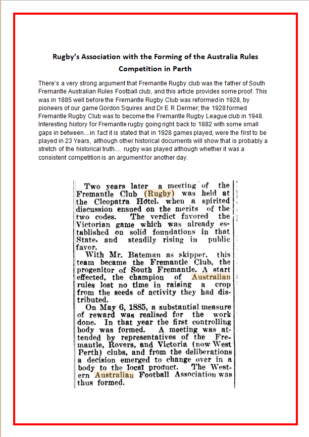 However Rugby didn't disappear from the Fremantle/Perth area and there was two different Fremantle sides (Wanderers & Pioneers) playing in the rugby union competition formed in the late 1890's and 1900s which included clubs with names such a Pirates (later to become Cottesloe), Nomads, Swan (Rangers & Wallabies), Sydney and City , Northern, and Athletic with the later two mentioned clubs joining together to become South Perth.