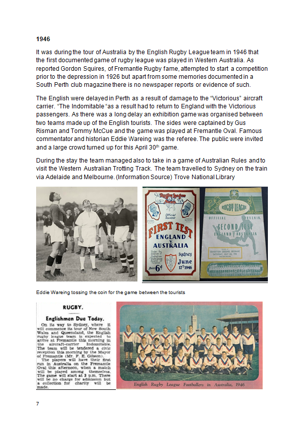Although not extensively played in WA in that period, many British touring teams made Fremantle their first port of call on their way to the Eastern States. The first documented game of Rugby League in WA was in 1946 at Fremantle Oval involving the 1946 Great Britain Touring Team. For more information visit "Early History" on this website.